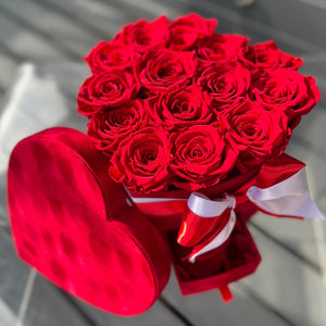 Brimming with real roses that last 1-3 years our Aubrey medium size box is absolutely perfect for gifting. The luxurious suede box boasts the perfect shape heart in a choice of pink, red or off white with a matching heart lid & adorable little keepsake drawer