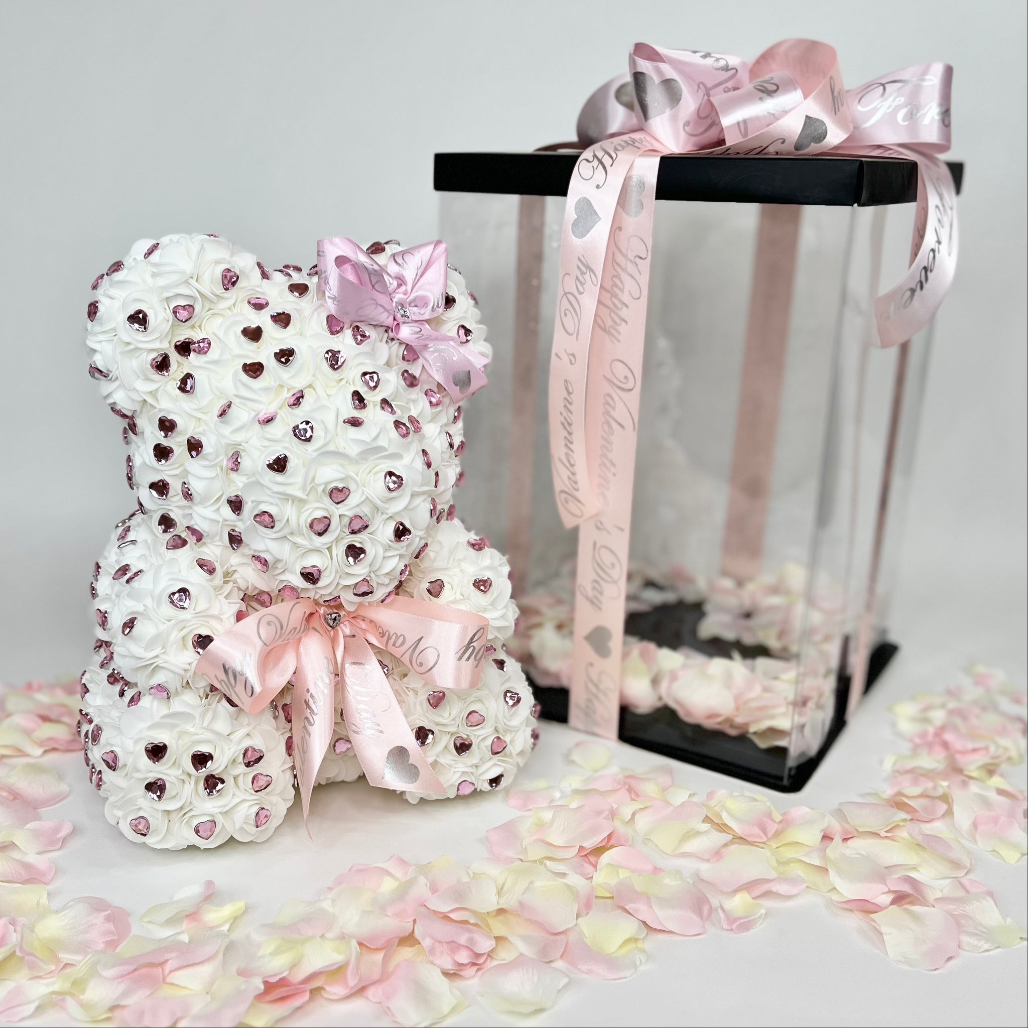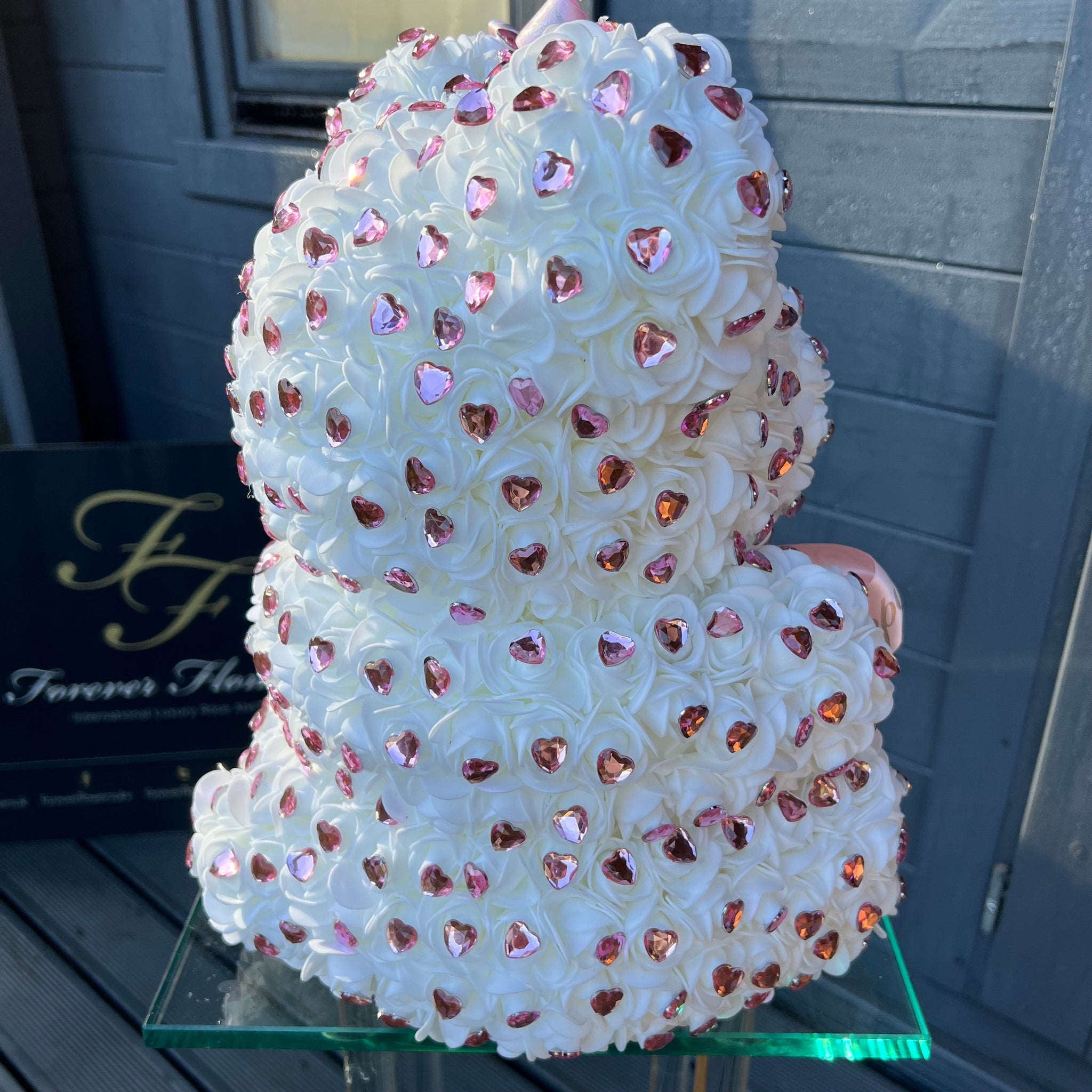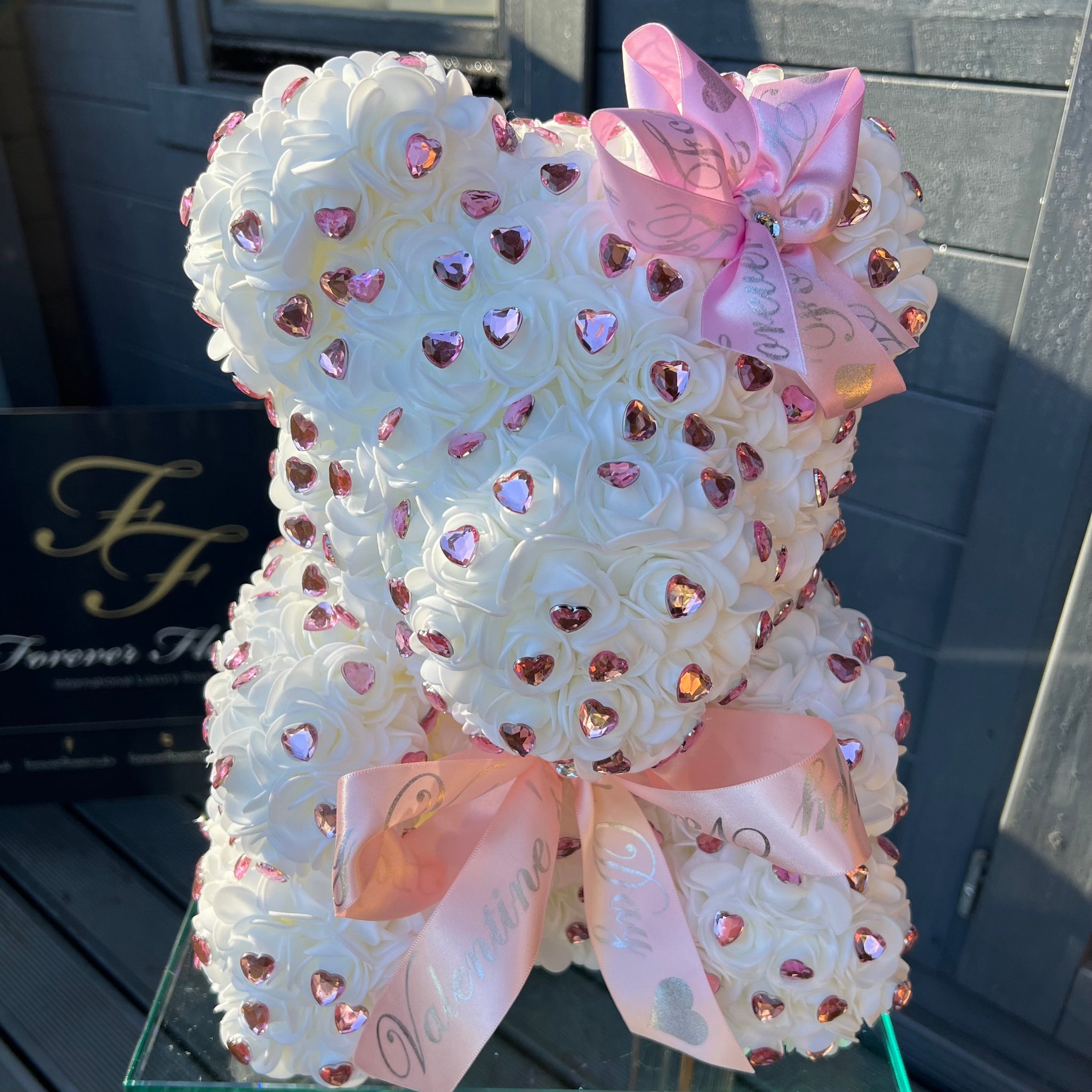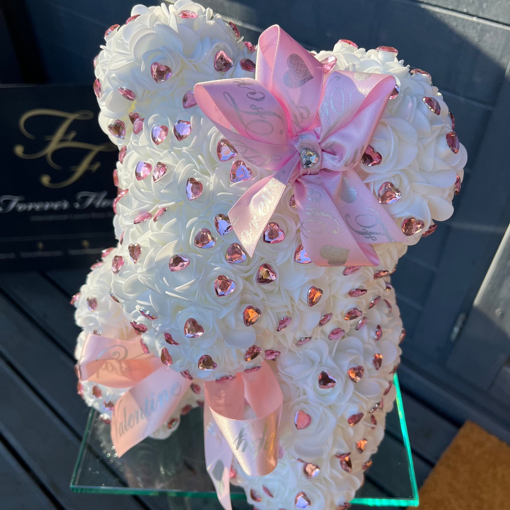 Put sparkle in thier eyes with this fabulously glam white foam rose 40cm twinkle bear! Fully 360 degree encrusted with pink diamante heart jewels in every single rose head this large rose bear comes presented in a beautiful clear window gift box, hand finished with luxurious satin ribbons & loose silk petals inside